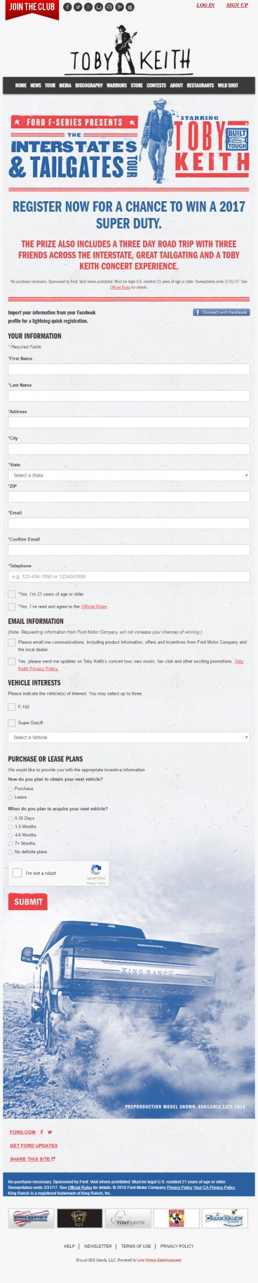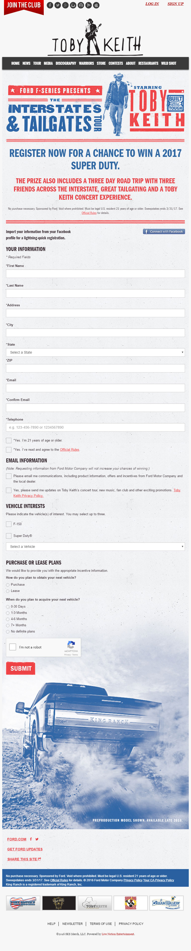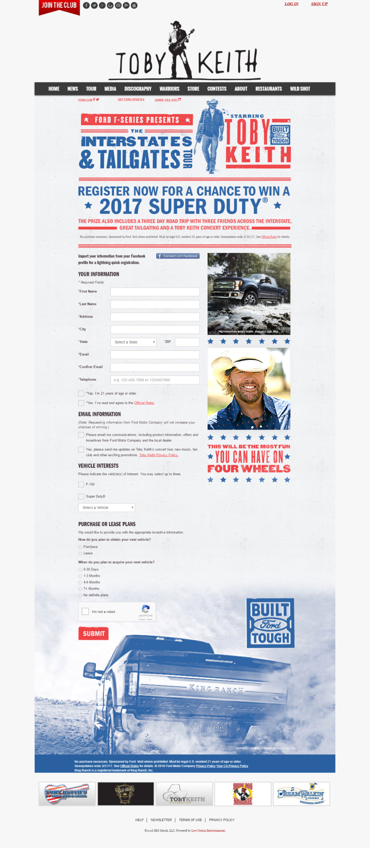 Consumers were invited to enter via a sweepstakes microsite for a chance to win a 2017 Ford Super Duty and an "interstate adventure" that included a Toby Keith concert.